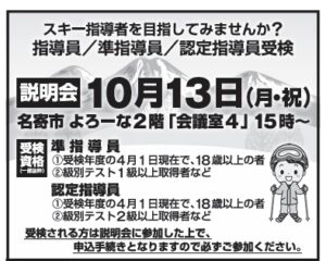 名寄地方スキー連盟では、2026年度スキー指導員等受検者を募集しています。 下記日程にて説明会を開催いたしますので、興味のある方は是非お越しください。 ご不明な点がございましたらメールにてご連絡ください。 nayoro.ski.school@gmail.com![]()